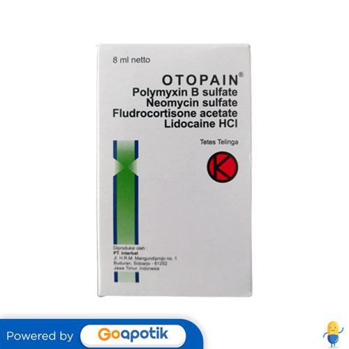 Deskripsi : PENGGUNAAN OBAT INI HARUS SESUAI PETUNJUK DOKTER. Otopain adalah obat tetes telinga yang efektif mengatasi penyakit infeksi pada telinga dengan beberapa gejalanya berupa rasa nyeri, bengkak, gatal dan telinga berair. Otopain merupakan obat kombinasi yang terdiri dari antibiotik, analgetik, dan antiradang. | Komposisi : Tiap 1 ml mengandung polimiksin B Sulfat 10,000 IU, neomisin Sulfat 5 mg, fludrokortison Acetat 1 mg, lidocain HCl 40 mg. | Dosis : ATURAN PAKAI HARUS SESUAI DENGAN PETUNJUK DOKTER. Dosis lazim otopain yang dianjurkan yaitu: Diteteskan pada telinga yang sakit sebanyak 4-5 tetes. Frekuensi tetesan dapat diberikan 2-4 kali dalam sehari, tergantung keparahan penyakit. | Indikasi : Digunakan untuk mengatasi infeksi telinga luar (otitis eksterna akut dan kronis) yang disebabkan oleh bakteri yang sensitif terhadap Polimiksin dan Neomisin Sulfat. Selain mengatasi infeksinya dengan membunuh bakteri penyebab, obat ini juga membantu mengatasi rasa sakit serta peradangan yang terjadi. | Perhatian Khusus : Obat tetes telinga otopain tidak dianjurkan untuk digunakan lebih dari 10 hari karena risiko ototoksisitas lebih besar dengan penggunaan jangka panjang. Pasien yang diobati dengan obat tetes telinga yang mengandung Neomisin harus berada di dalam pengawasan klinis yang ketat. | Kemasan : Botol, 8 ml | NIE : DKL7217617148A1