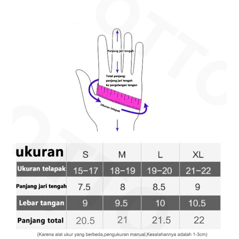 SIZE XL panjang jari tengah : 9 CM Lebar telapak tangan : 10.5 CM panjang satu putaran telapak tangan : 22CM (pengukuran manual,Kesalahan akan menjadi 1-3cm)