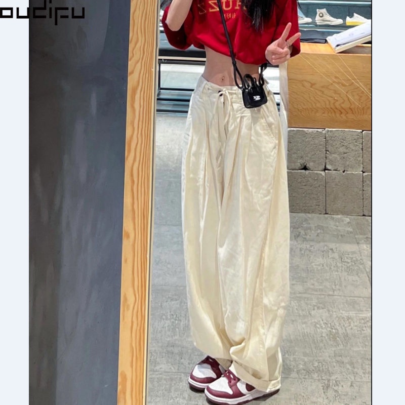 OUDIFU Kasual Celana Lurus Kaki Wanita Musim Gugur 2022 Baru Pinggang Tinggi Desain Ramping Pinggang Elastis Lebar Kaki Celana Panjang