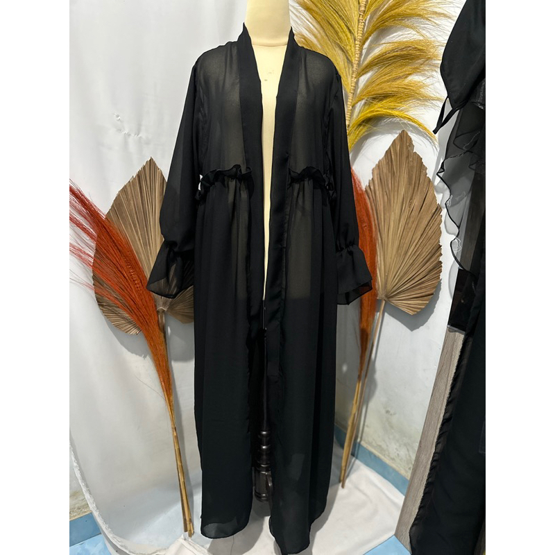 outer ini dari material sifon transparan yang cantik mengikuti lekuk tubuh tp bagian pinggang rempel cute sehingga terlihat gemoy dipakainya. kita buat bagian depan muka terbuka dgn cuttingan ban besar supaya estetik ketika dikenakan.