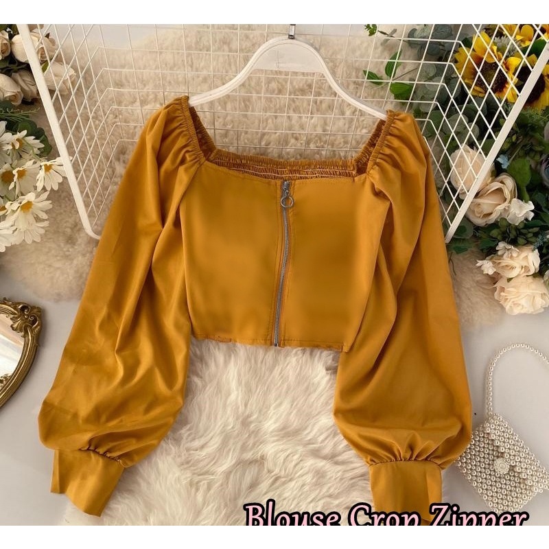 Detail Outer Zipper Crop Top Balon Atasan Casual Wanita Korea