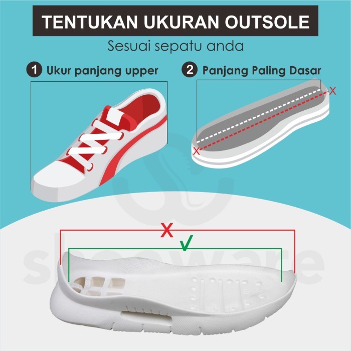!!!HARAP DIBACA ** HARAP DIBACA!!! - Ukurlah bagian upper sepatu ujung depan sampai belakang - Outsole yang kami jual diukur dari dalam paling dasar ( bukan bagian luar outsole) - Gunakan satuan CENTIMETER supaya lebih pasti untuk mengetahui ukuran outsole, (karena untuk size EUR setiap merk dan type sepatu mempunyai perbedaan CENTIMETER nya) - Outsole ini bisa universal kesemua sepatu, asalkan bisa menilai kecocokan dengan sepatunya. (kendalanya terkadang untuk dibagian samping sepatu yang tidak semua bagian tertutupi) ---------------------------------------------------------- - Diharapakan selalu menanyakan stock sebelum membeli. - Jika ada permintaan Dan size tulislah dibagian catatan sebelum checkout atau menanyakan ketersediaan di chat. - jika size dan model kosong , kita akan chat untuk konfirmasi. apabila dalam 1x24 jam tidak ada tanggapan. akan kita kirim random