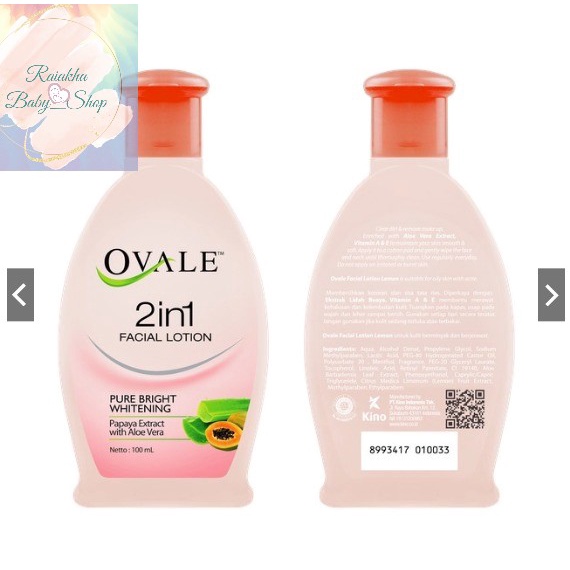 Ovale Facial Lotion Pure Bright 200ml Ovale Facial Lotion Pure Bright membersihkan kotoran dan sisa tata rias dengan Ekstrak Pepaya membantu mencerahkan kulit wajah. Diperkaya dengan Ekstrak Lidah Buaya, Vitamin A & E membantu merawat kehalusan dan kelembutan kulit. Keunggulan: -Membersihkan make up, kotoran, dan debu pada kulit wajah dengan maksimal -Mengandung ekstrak bunga & buah yang menutrisi kulit wajah -Diperkaya dengan Aloe Vera yang melembutkan kulit wajah