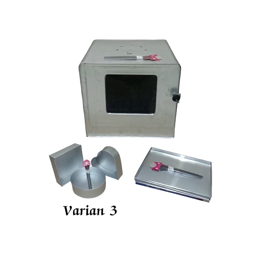 oven terbuat dari bahan galvalum anti karat. bisa digunakan untuk membuat kue kering kue salju dan bolu. mempunyai 3 rak susun. Kaca sengaja di copot dan dibungkus lagi dengan kardus supaya aman sampai tujuan