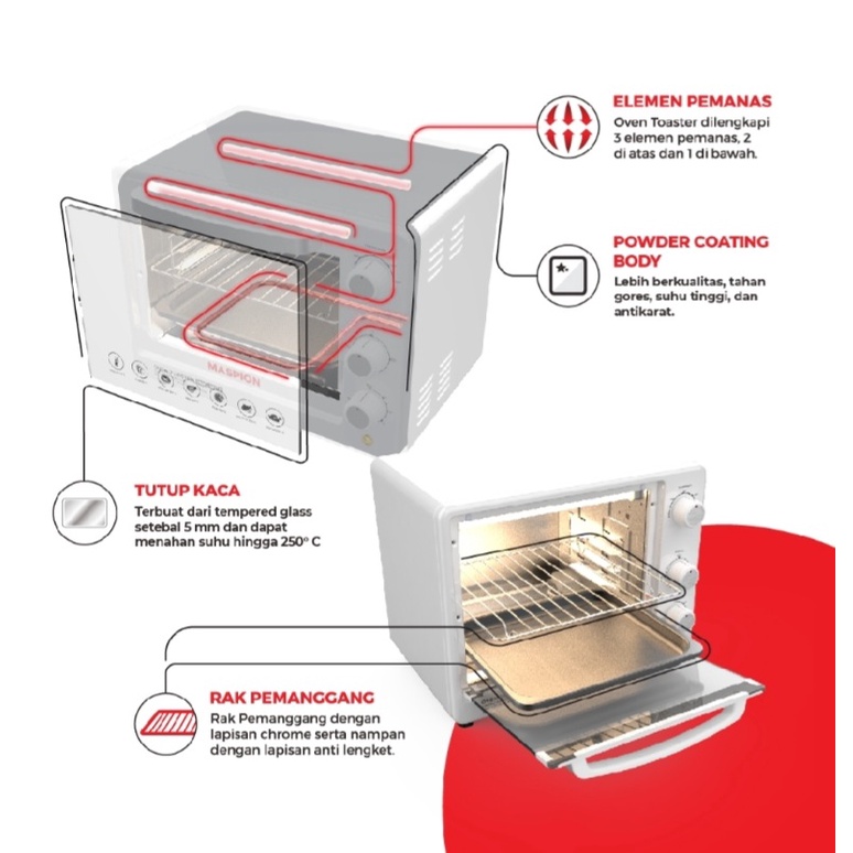 Spesifikasi: - Merek: Maspion - Tipe: MOT 1801s - Kapasitas 18 Liter - Daya 425 watt perelemen - Timer 60 minutes with bell - Rack toaster, Baking tray - Baking Sheet / Tray Dimension : 24x27.5x2 cm - Product Dimension: 40x31x27 cm - Garansi Maspion 1 tahun
