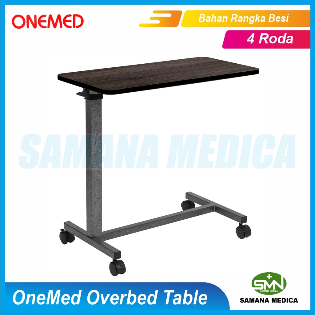 Overbed Table Rumah Sakit Indomed ONEMED Table dirancang untuk memudahkan pasien pada waktu posisi makan, dengan mendorong meja ini mendekati ranjang pasien. Rangkanya terbuat dari bahan besi dan tingginya bisa disesuaikan serta memakai 4 roda.