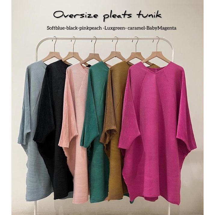 oversize pleats tunik bahan premium pleats LD free (muat sampe jumbo) P +-95cm (ukurnya dihanger dlu ya, jgn ukur d bawah.. karna bahan plisket horizontal Akan Lbh panjang saat dipake atau d hanger Dr pada ukur d lantai)