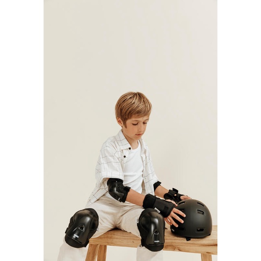 OXELO Play Scooter Dekker Pelindung Sepatu Roda Skuter 3 Bagian Untuk Anak ------------ Tim penggemar sepatu roda kami telah mengembangkan set bantalan sepatu roda ini. Anak Anda dapat belajar skate dengan nyaman dan aman. Apakah anak Anda baru belajar skate? Untuk membantu mereka menemukan kaki mereka dengan aman dan nyaman di atas empat roda, kami telah membuat set pelindung siku, lutut, dan pergelangan tangan ini.