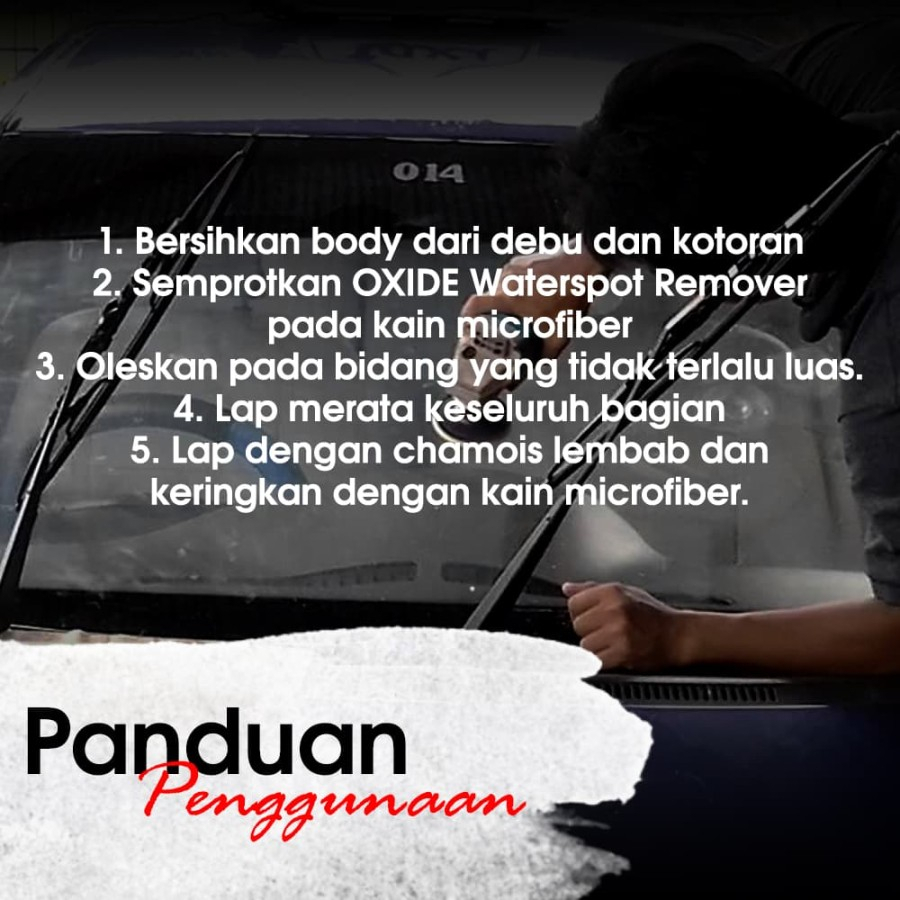 Aturan Pakai: 1. Kocok produk terlebih dahulu. 2. SEMPROTKAN OXIDE WATERSPOT Remover Pada kaca yang ingin dibersihkan lalu ratakan dengan kuas. 4. Lalu Bilas menggunakan air bersih yang mengalir. 5. Apabila masih ada noda yang tertinggal, ulangi poin 2 hingga 3.