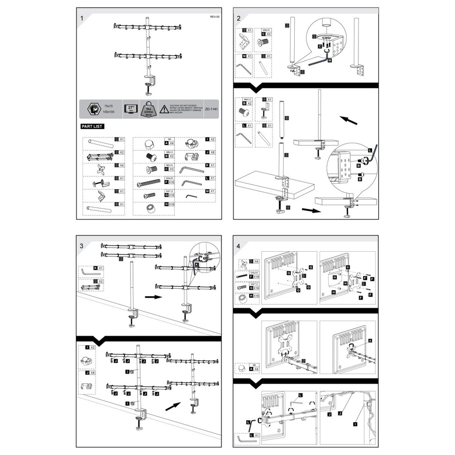 SPECIFICATION Brand : OXIMUS Type : HYDRA-ZD1141 Support : 1 - 4 Monitor/TV VESA Support (mm) : 75x75 - 100x100 Fit Size : 13" - 27" Tilt : + 90 ° / - 90 ° Swivel : 180 ° Rotate : 360 ° Max Height Pole (cm) : 80 (Default) Max Load (Kg) : 9 / arm Max Desk-Clamp Clearance (cm) : 8 Color : Black Mounting Hardware Included : Yes 1pcs Package Dimension(cm) : 44 x 18 x 9.8 Gross Weight (Kg) : 6 1Box Package Dimension (cm) : 47 x 43 x 21 Gross Weight : 24 Quantity (Pcs): 4
