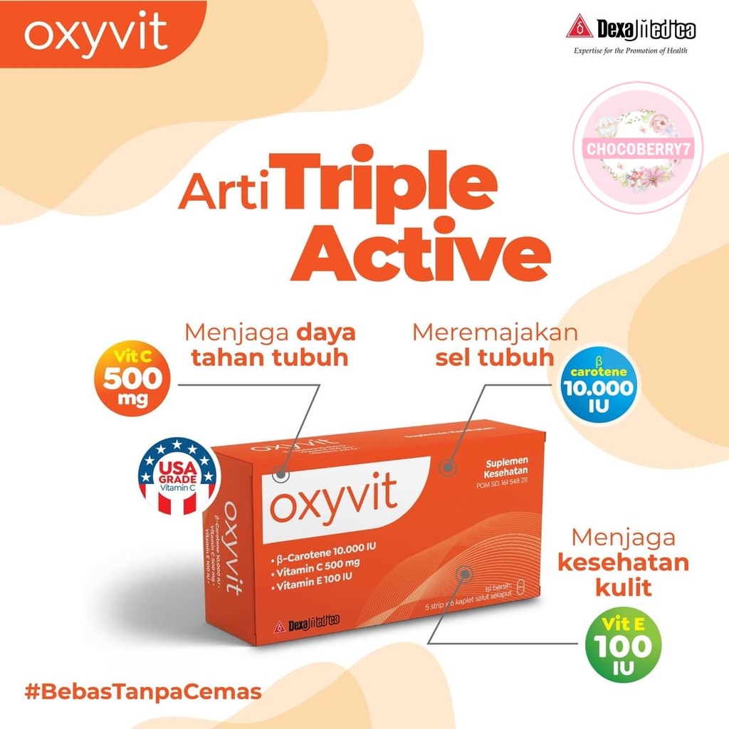 Oxyvit mengandung Vitamin C (Vitamin C USA Grade dengan bahan baku dari Amerika), Vitamin E dan Betakarotene yang berfungsi untuk membantu meningkatkan daya tahan tubuh dan memperbaiki sel rusak. Cukup 1 kapsul sehari untuk memenuhi dosis harian