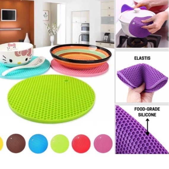 Keunggulan Produk : - Tahan Panas dan tidak licin - Dapat digunakan untuk alas piring, mangkok, panci sayur, teko, dll - Mudah dibersihkan karena terbuat dari bahan silicon yang berkualitas dan tidak lengket - Bahannya lembut dan bisa ditekuk , bisa berfungsi sebagai alas pegangan pengangkat kuali atau panci yang panas