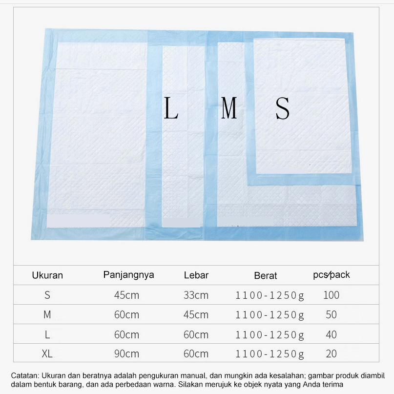 ---Nama komoditas: Popok Pelatihan Hewan Peliharaan ---Gunakan objek: Kucing/Anjing ---Bahan: kain bukan tenunan + molekul penyerap air ---Ukuran: S=30*45cm; M=45*60cm; L=60*60cm ---Fungsi: 1. Inti penyerap super, cairan berubah menjadi gel setelah kontak, lapisan plastik anti bocor untuk mencegah kerusakan pada lantai, atraktan bawaan dengan cepat mengeringkan permukaan, membuat pembersihan lebih mudah. 2. Ini juga akan menjadi lembut dan kering setelah menyerap air, dan tidak akan membahayakan hewan peliharaan, juga dapat membuat hewan peliharaan yang sakit atau tua lebih higienis. 3. Cocok untuk semua jenis hewan peliharaan, dapat digunakan dengan penginduksi buang air besar untuk membantu melatih hewan peliharaan ke toilet.