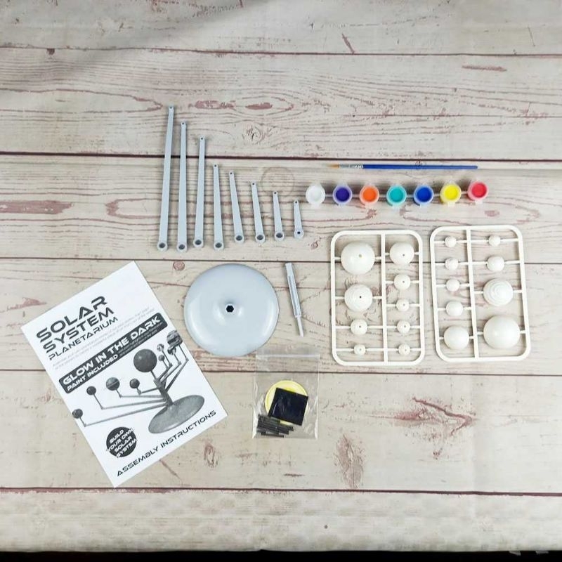 Kelengkapan Produk Rincian yang Anda dapatkan untuk pembelian produk ini: 1 x 360 Rotating Stand & Base 9 x Planet Display Rods 9 x Planet of Solar System 7 x Assorted Coloured Paints 1 x Kuas 1 x Amplas 1 x Panduan Penggunaan Spesifikasi Pajangan Miniatur DIY Tata Surya 9 Planet Solar System Planetary - 2135 Material Plastik Dimensi Diameter Base: 10 cm Panjang Tangkai: 4 - 17 cm Diameter Planet: 12 - 37 mm