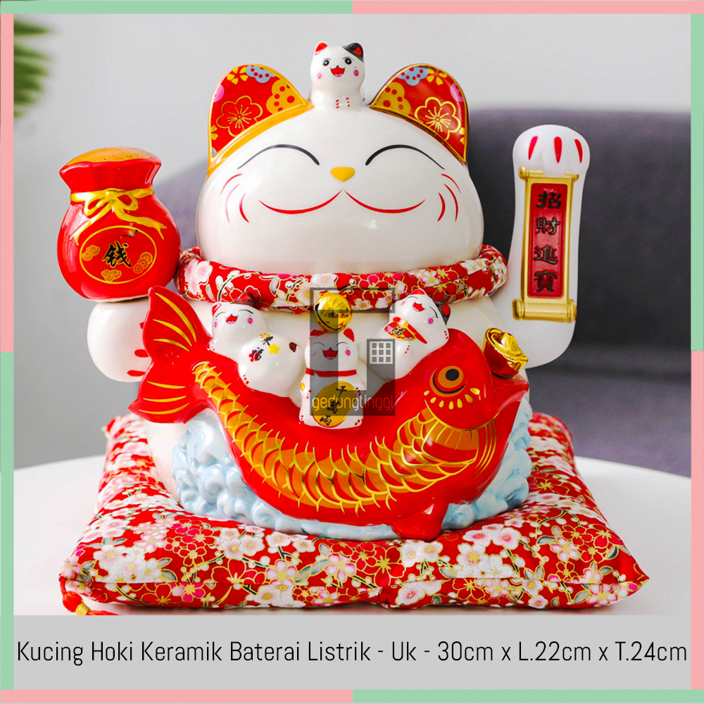 Spesifikasi Pajangan Patung Hiasan Boneka Dekorasi Kucing Bawa Panggil Rejeki Rezeki Hoki Maneki Neko Maneko Neki ManekiNeko Lucky Cat Keberuntungan Keramik Merah Baterai Batrai Batre Listrik Tangan Goyang Gerak Meja Etalase Toko Resto Cafe Cina China Jepang Besar XL