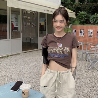 ☸Dipotong top Amerika gaya manis dan pedas retro hot gadis pin gesper T-shirt wanita cetak pribadi all-match pengurangan usia top #COD