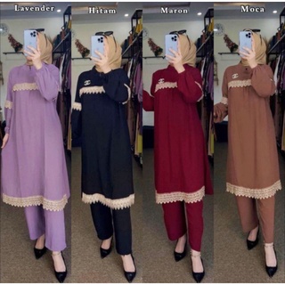 Joyagh One Set Tunik Renda Crinkle Airflow Setelan Wanita Lengan Panjang Fashion Muslim Kekinian LD 120 cm