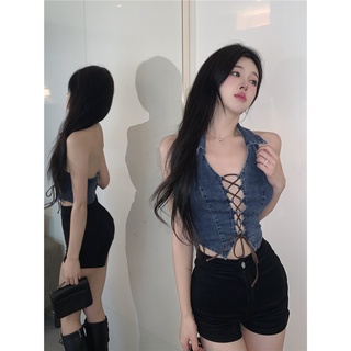 Suhao Tanktop hot girl sexy strappy denim kamisol rompi wanita musim panas pakaian luar murni keinginan tanpa lengan pendek halter top