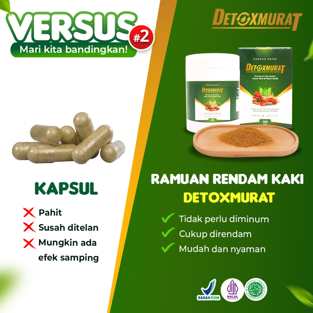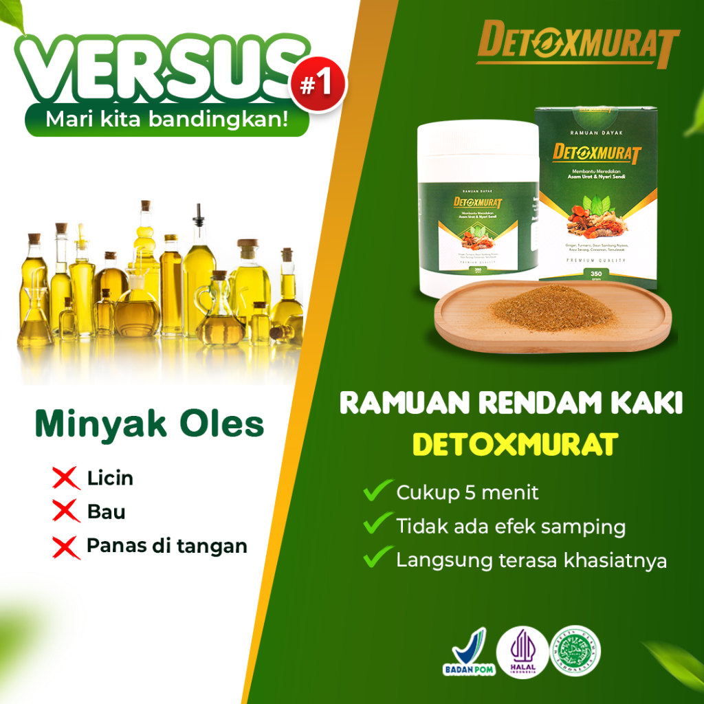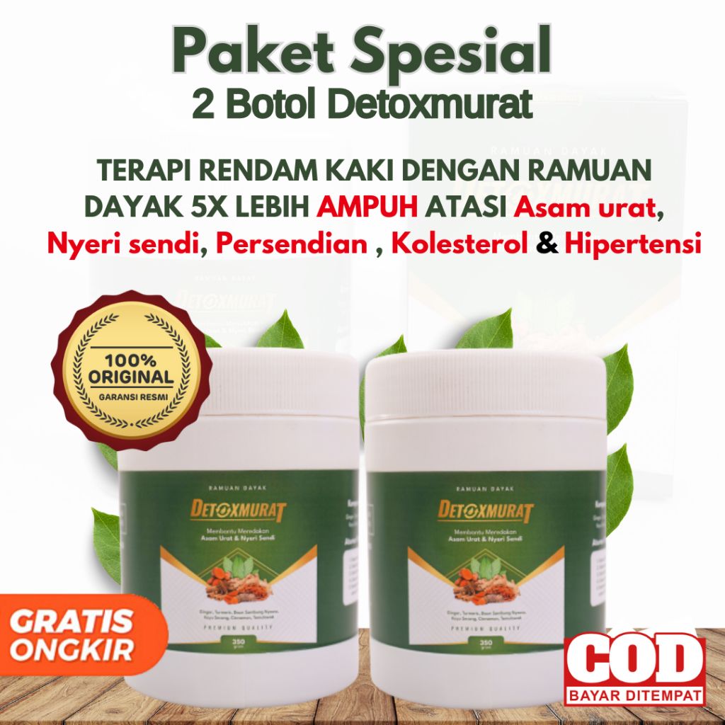 Keunggulan: 1. Alami 2. Kualitas premium 3. Membantu meringankan berbagai penyakit dengan merendam kaki Manfaat utama Detoxmurat membantu mengatasi: ● Penyakit Jantung ● Hipertensi ● Stroke ● Diabetes ● Asam Urat ● Rematik ● Stroke ● Nyeri Sendi ● Pegal Linu ● Kesemutan ● Kolesterol ● Sakit pinggang ● Vertigo ● Migrain