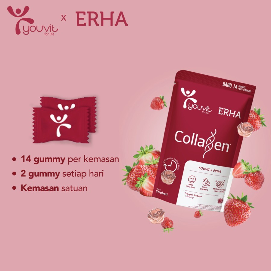YOUVIT Erha Collagen merupakan perpaduan suplemen collagen dan vitamin C dalam format gummy (jelly kunyah) kualitas premium. YOUVIT Erha Collagen mengandung 1000 mg kolagen dan vitamin C yang akan menutrisi kulit dari dalam, mengurangi garis-garis halus, dan menjaga elastisitas kulit sehingga kulit tampak lebih muda dengan hanya mengonsumsi dua gummy setiap hari. Dilengkapi rasa stroberi yang enak dan gummy berbentuk mawar yang cantik akan membuat konsumsi suplemen kolagen menjadi pengalaman yang baru, menyenangkan, dan tak terlupakan!
