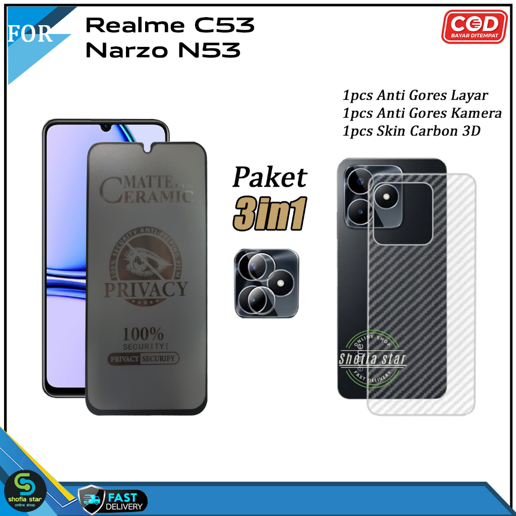 PAKET 3IN1 Tempered Glass Ceramic Privacy Realme C53 Nfc Narzo N53 Anti Spy Full Cover