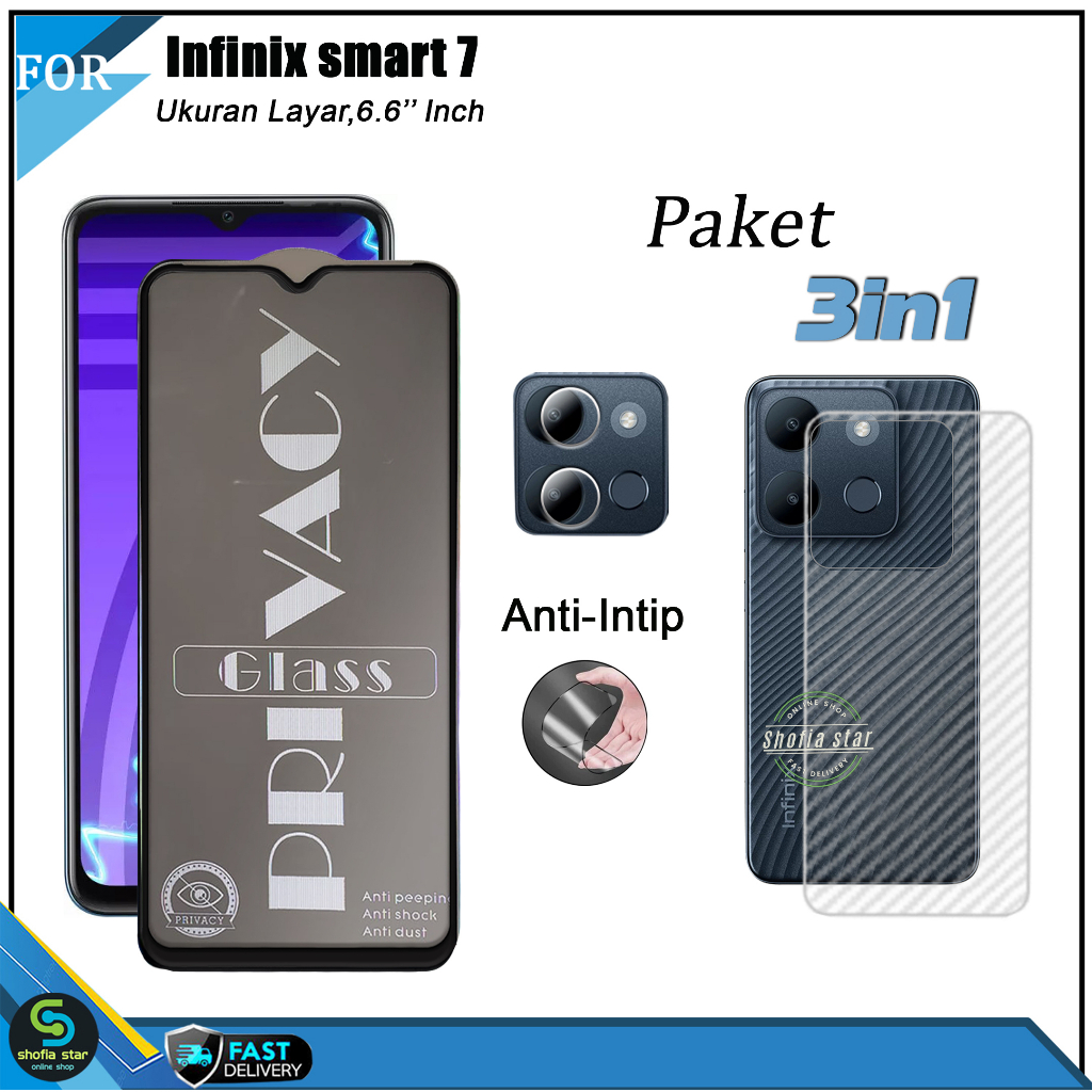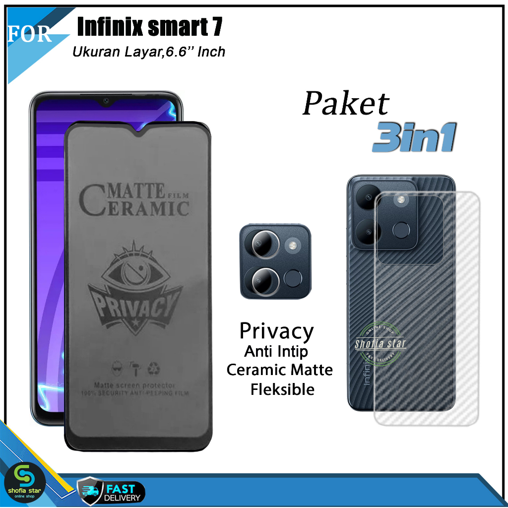 Detail PAKET 3IN1 Tempered Glass Ceramic Privacy Infinix Smart 7 Infinix Smart 7 HD Anti Spy Full Cover Bonus Anti Gores Kamera Dan Skin Carbon 3D