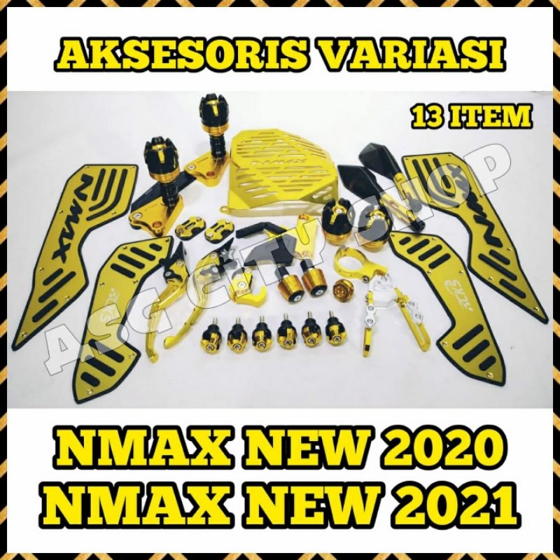 Paket Variasi Nmax New 2020. 13 Item: - Pijakan Kaki Set - Slider - Cover Radiator - Handle Set - Gantungan Barang - Jalu Stang - Tutup Oli - Kleman Selang - Tutup Kaliper - Jalu As Roda - Spion Tomok - Tutup Minyak Rem (2pcs) - Jalu Spakbor/Jalu Tameng Knalpot (6pcs)