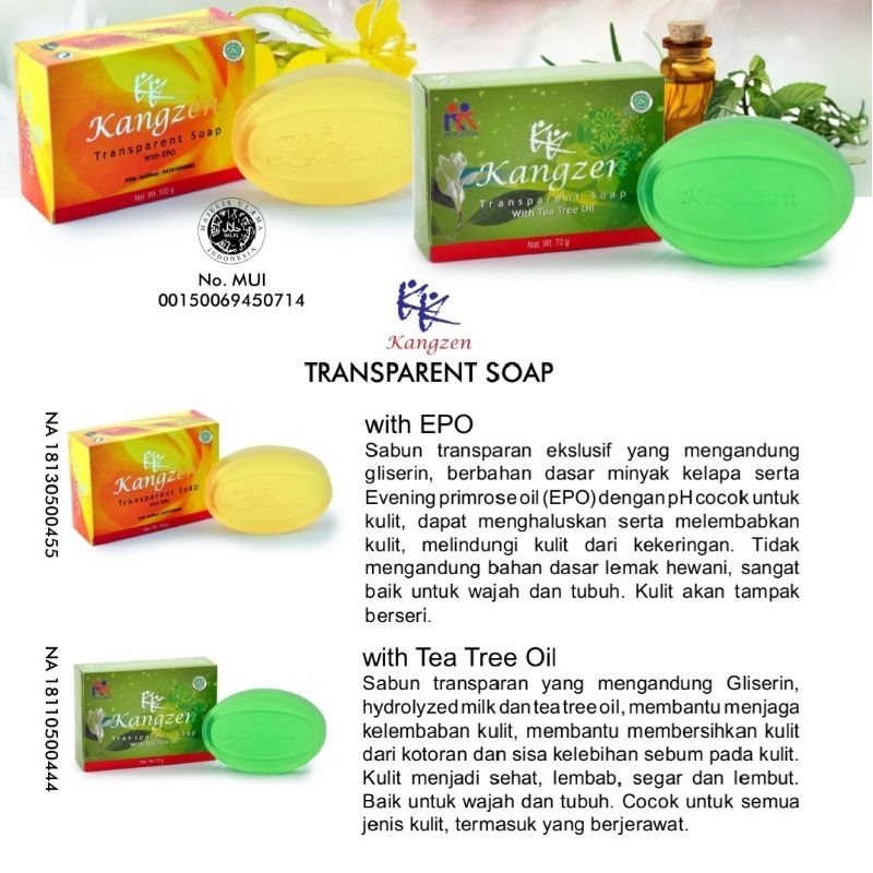 🔰Kangzen Transparant Soap With TTO (Tea Tree Oil) Sabun transparan yang mengandung Gliserin, hydrolyzed milk dan tea tree oil, membantu menjaga kelembaban kulit, mengatasi pertumbuhan bakteri Cutibacterium acnes, mengurangi peradangan pada kulit, membantu membersihkan kulit dari kotoran dan sisa kelebihan sebum pada kulit. Cocok untuk semua jenis kulit, termasuk yang berjerawat ( Sangat Di Rekomendasikan )