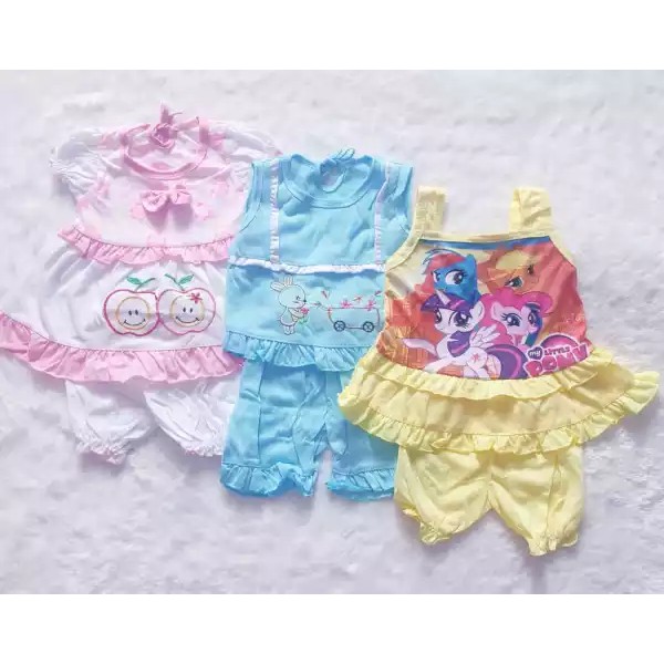 Harga sudah termasuk 3 stelan Baju Model Mix 3 model ( Tidak Bisa Pilih ) Warna Mix 3 Warna ( Tidak Bisa Pilih ) Model : Dress Setelan BabyUsia : 0-12 bulan ( tergantung badan anak ) Bahan : kaos Untuk motif dan warna random sesuai stok terbaru. Motif selalu yang unik dan lucu buat anak - anak. Warna cerah sesuai untuk bayi. Ukuran Baju : Lebar Dada : -+ 26 Cm Panjang Baju : -+ 33 Cm Ukuran Celana : Lingkar Pinggang : -+ 30-55 Cm ( Karet ) Panjang Celana : -+ 22 Cm
