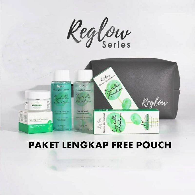 SATU PAKET REGLOW MENDAPATKAN : 1.Reglow Intensive Cream 2.Reglow toner + Micerall Water 3.Reglow Facial Wash 4.BONUS POUCH ORIGINAL