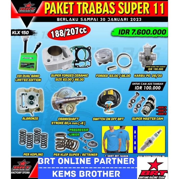 paket komplit brt klx trabas ini sudah sangat lengkap. . ga usah repot repot cari barang lain. tinggal pasang aja. terdiri dari . CDI hijau Limitted Edition . Kruk As klx BRT . Blok berdiameter piston 63mm ceramic forged atau . Silinder Head ukuran klep 3125 plus Free Porting CNC . Atau . Blok Berdiameter piston 66mm ceramik forged dengan diameter klep 34/29 . mastercam tipe R plus RRA. . Per klep dan per kopling . Switch on off BRT . Super flow BRT tipe SF 28 ( karburator ) . Kaos BRT Kerens . segera d order ya. . happy shopping