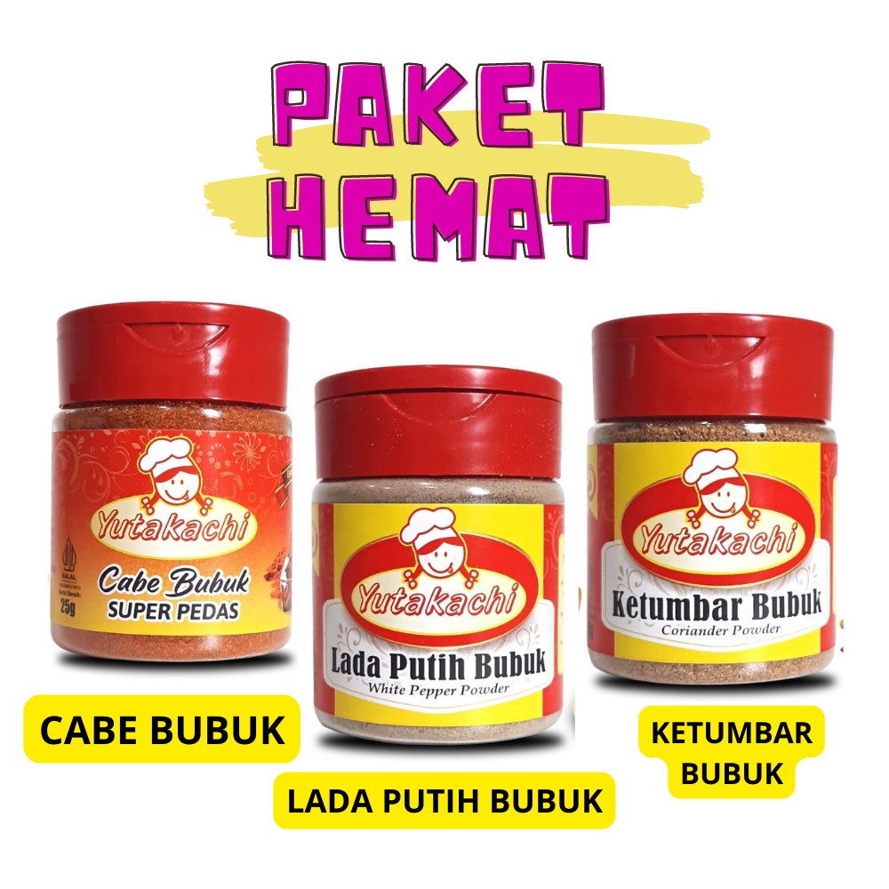PAKET HEMAT BUMBU DASAR "YUTAKACHI" KEMASAN BOTOLAN Paket hemat ini terdiri dari: - Cabe bubuk super pedas 25gr - Lada putih bubuk 37gr - Ketumbar Bubuk 25gr