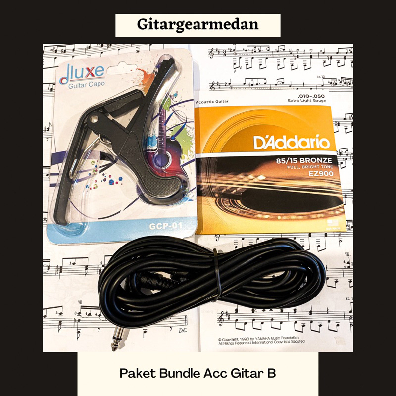 1 Paket Bundle A ini terdiri dari: - 1pcs Capo Gitar Besi merk Dluxe (Rp. 32,500) - 1set Senar Gitar Akustik D’addario EZ900 (Rp. 32,500) - 1pcs Kabel Jack 3Meter (Rp. 29,900)