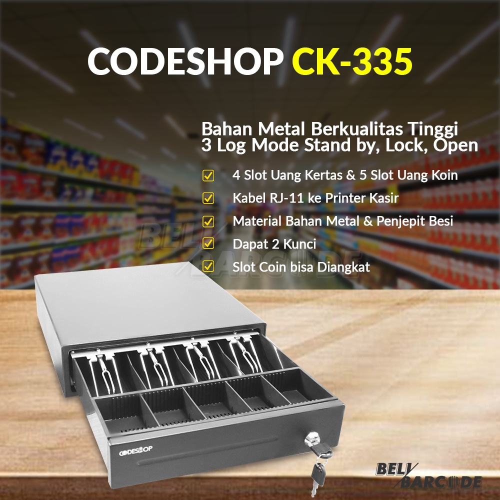 + Laci Kasir Codeshop CK-335B - 4 Slot Uang Kertas & 5 Slot Uang Koin - Kabel RJ-11 ke Printer Kasir - Material Bahan Metal & Penjepit Besi - Dapat 2 Kunci - Slot Coin bisa Diangkat