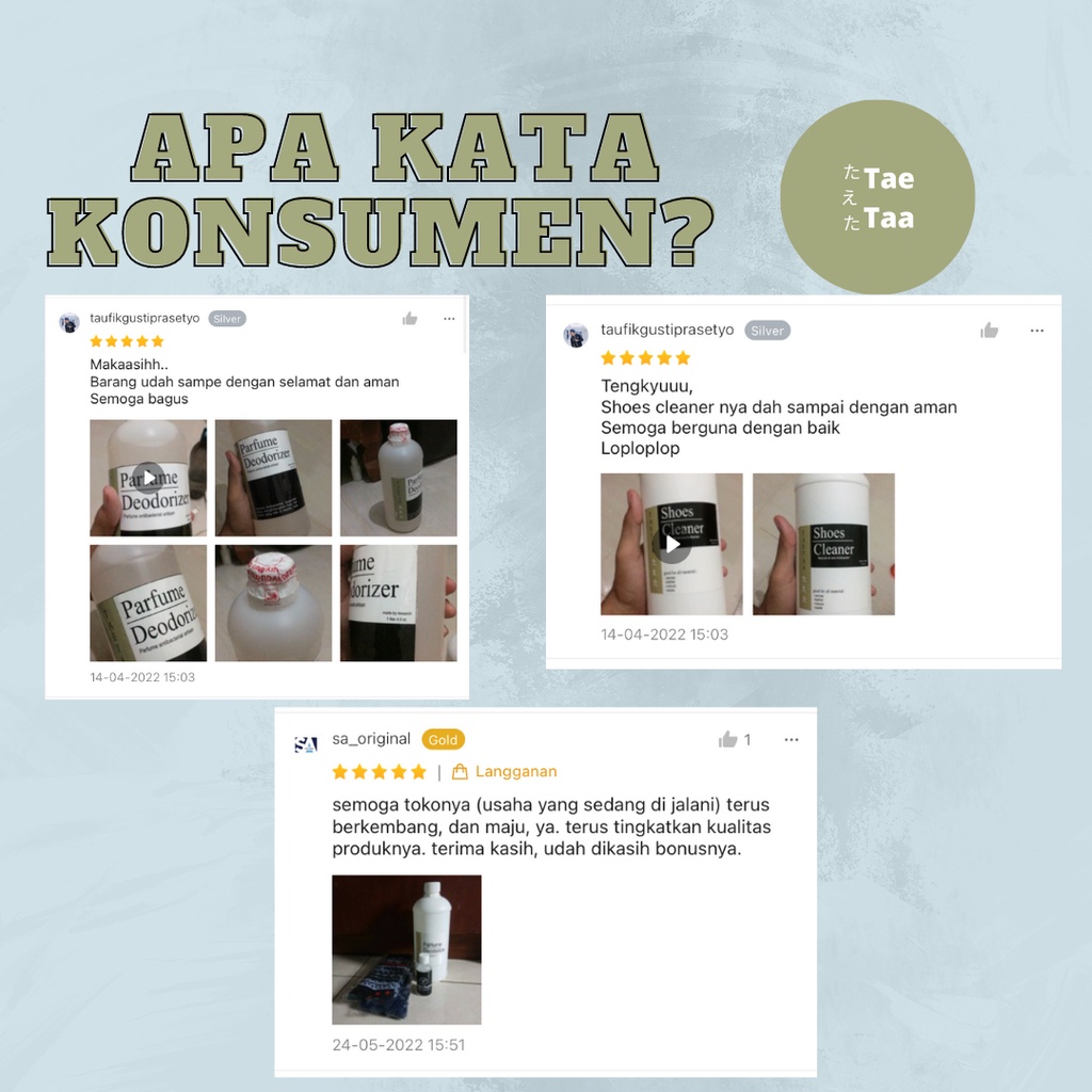 Paket Harum Bersih By Taetaa Company Pembersih Sabun Cuci Sepatu Dan Parfum Sepatu Helm Antibau Dan Bakteri 100 Ml Taetaacompany Paket Harum Bersih . Hallo Rekan Rekan Taetaa, Kita Kasih Paket Murmer Agar Kalian Dapetkan Sepaket Harum Bersih Untuk Seoatu Kalian. . harum bersih ini kita buat untuk kalian lebih memudahkan merawat sepatu kalian agar tetap terjaga kebersihan sepatu kalian terhindar dari bakteri dan bau yang menempel. . Untuk Parfum Bisa Menghilangkan bau dan bakteri yang menempel di sepatu atau helm. Wangi yang kami keluarkan mempunyai harum yang berbeda dari produk yang lain. • Selain itu, parfume ini juga bisa digunakan untuk tas dan topi Tunggu Apalagi? • Perawatan shoes cleaner atau pembersih sepatu di Taetaa menggunakan bahan baku kimia yang aman 100% (tidak berbahaya) dan produk aksesoris menggunakan bahan baku yang sudah melalui riset terbaik, dijamin produk ini tidak akan merusak atau memudarkan warna sepatu terbaik kakak yaaa :)