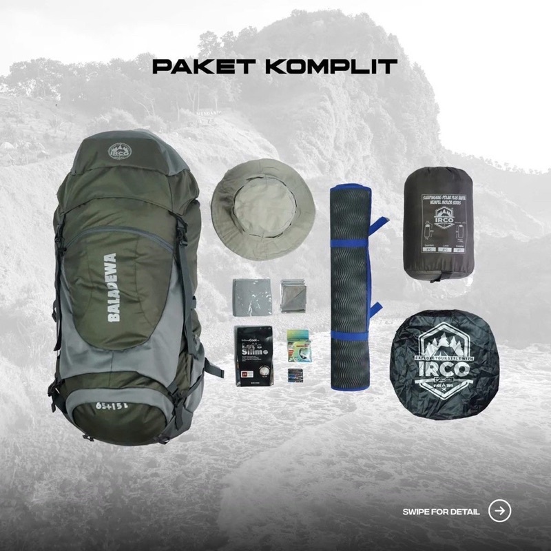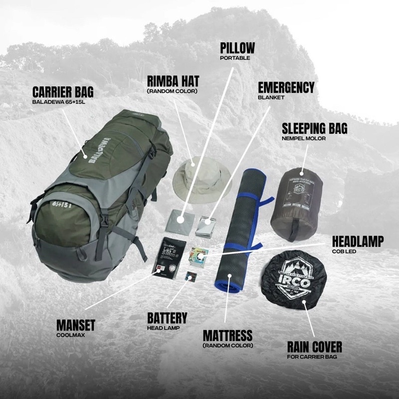 Detail Paket Camping Lengkap 10 Item - Tas Carrier 65L Rain Cover Sleeping Bag Bantal Matras Manset Topi Rimba Emergency Blanket Headlamp LED Battery