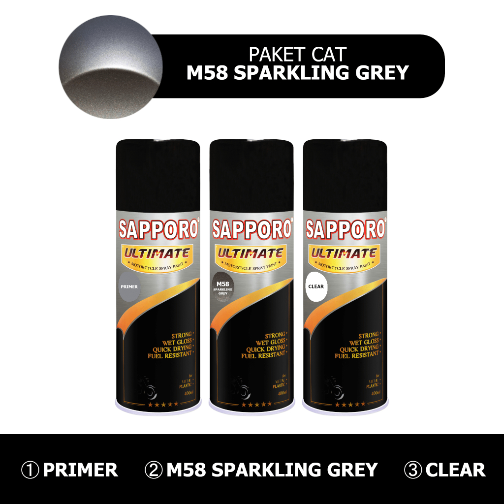 HARGA YANG TERTERA ADALAH HARGA UNTUK 1 PAKET YANG BERISI 3 KALENG CAT SEMPROT Warna yang tercantum di dalam paket: 1. B12 Primer Grey / B22 PU 1K Surfacer Grey / K22 Super Primer / 2K22 EP Primer Surfacer *Pilih Salah Satu* 2. M58 Sparkling Grey 3. C81 Clear Gloss / C82 Clear Doff / K81 PU 1K Clear Coat / K82 PU 1K Satin Clear / 2K81 Clear Coat HS *Pilih Salah Satu*