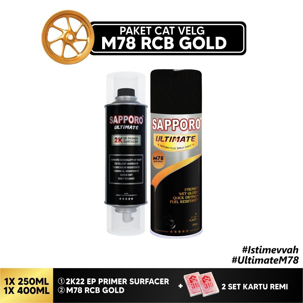 Detail Paket Cat Velg M78 RCB Gold + Free Kartu Remi / Sapporo Ultimate / Cat Spray Semprot Aerosol Terbaik