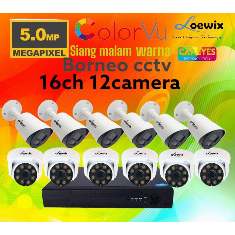 Detail PAKET CCTV COLORVU 5MP 16 CHANNEL 12 KAMERA LOEWIX FULL COLOR SIANG MALAM