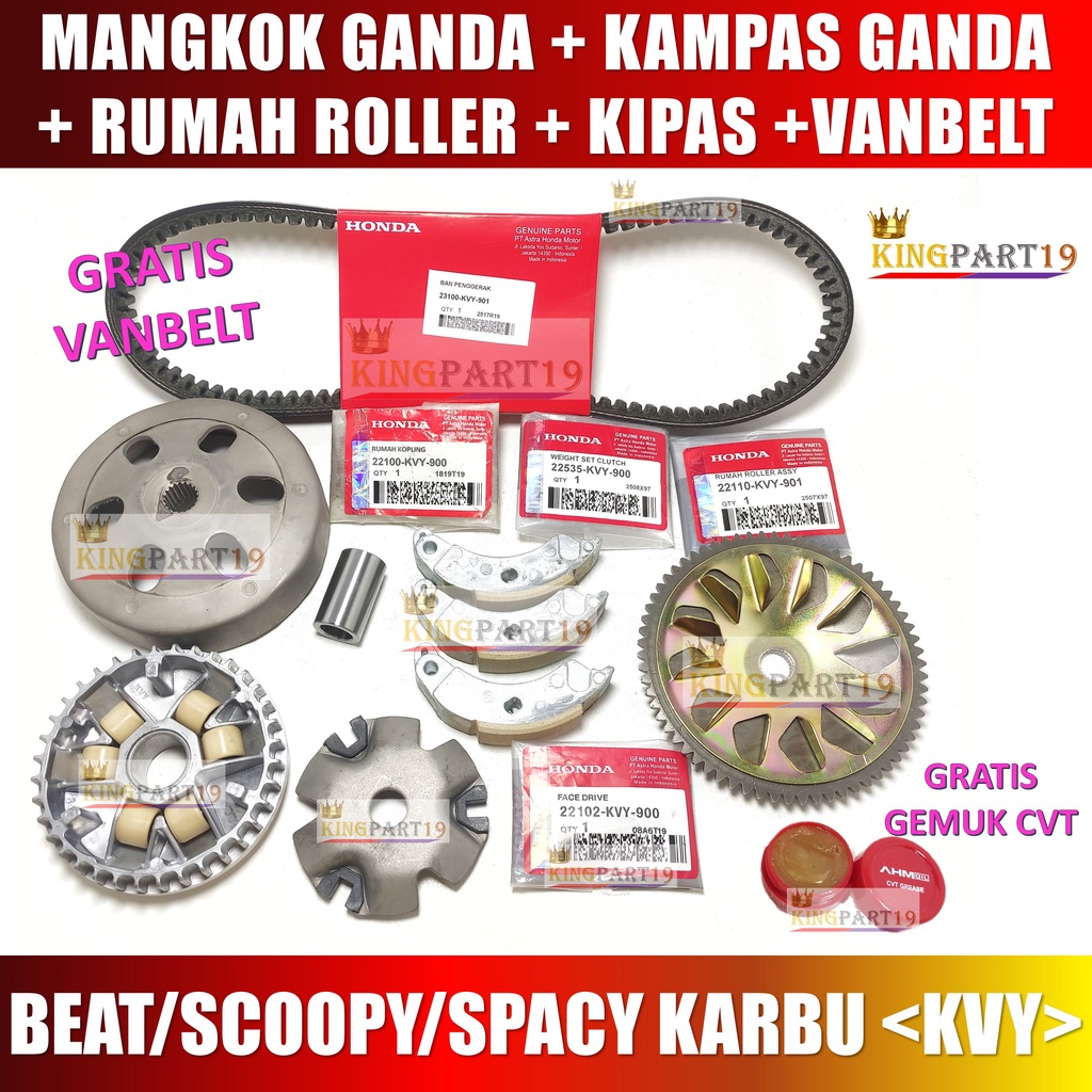 Paket Terdiri Dari (Sesuai Gambar) : - RUMAH ROLLER SET - AS BOS - ROLLER SET - RUMAH KOPLING / MANGKOK GANDA - KAMPAS GANDA - KIPAS ROLLER - VANBELT (GRATIS) - OIL CVT (GRATIS)