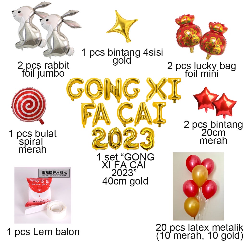 Dipaket ini kamu akan mendapatkan : 1 set HAPPY NEW YEAR / GONG XI FA CAI 40cm gold 1 set 2023 40cm gold 2 pcs RABBIT foil jumbo 2 pcs PROSP FISH foil mini 1 pcs SPIRAL foil bulat 40cm merah 2 pcs BINTANG 20cm merah 1 pcs BINTANG 4SISI gold 10 pcs LATEX metalik merah 10 pcs LATEX metalik gold 1 pcs LEM balon