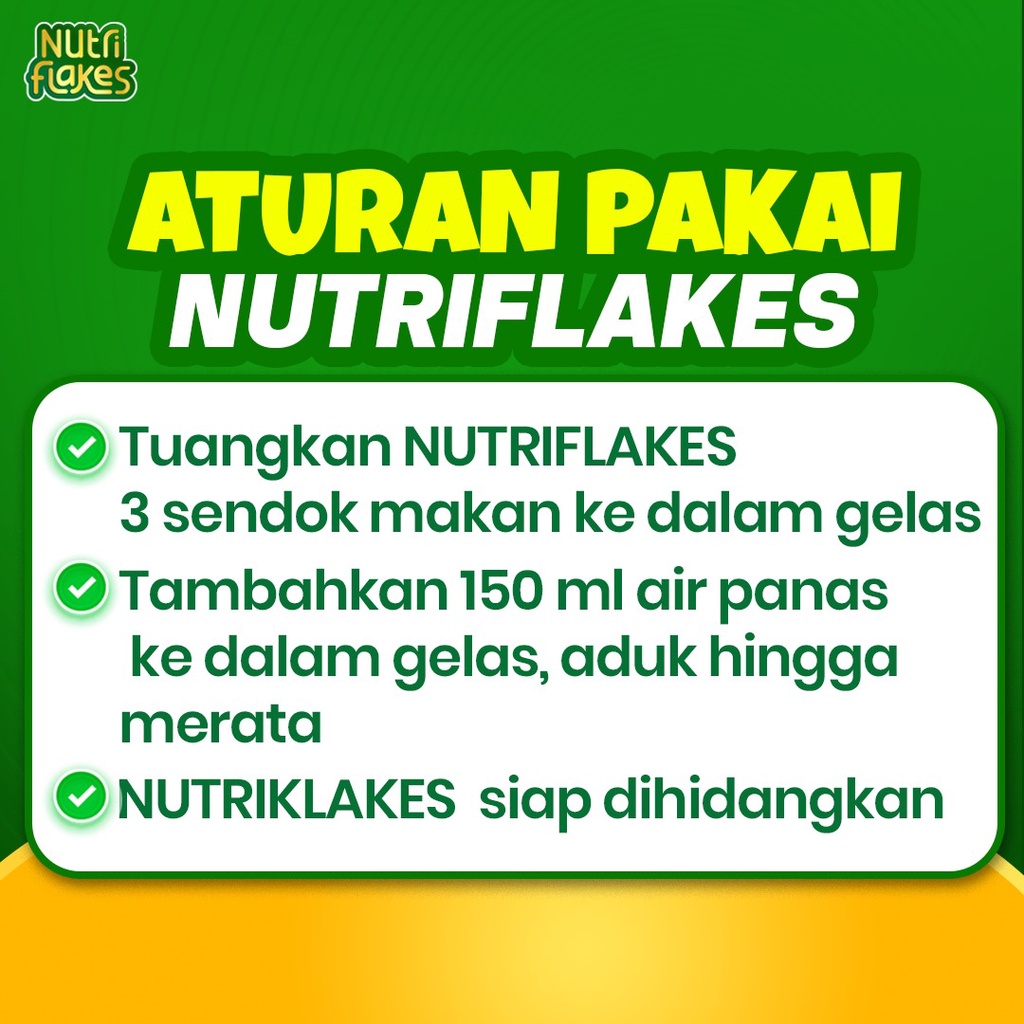 ๐๐ญ๐ฎ๐ซ๐๐ง ๐๐๐ค๐๐ข / ๐๐๐ซ๐ ๐๐จ๐ง๐ฌ๐ฎ๐ฆ๐ฌ๐ข ๐๐ฎ๐ญ๐ซ๐ข๐๐ฅ๐๐ค๐๐ฌ: ๐Tuangkan 3 sendok makan Nutriflakes kedalam gelas. ๐Tambahkan 150ml air panas mendidih, aduk hingga merata. Siap di hidangkan ๐Baik diminum sebelum atau sesudah makan