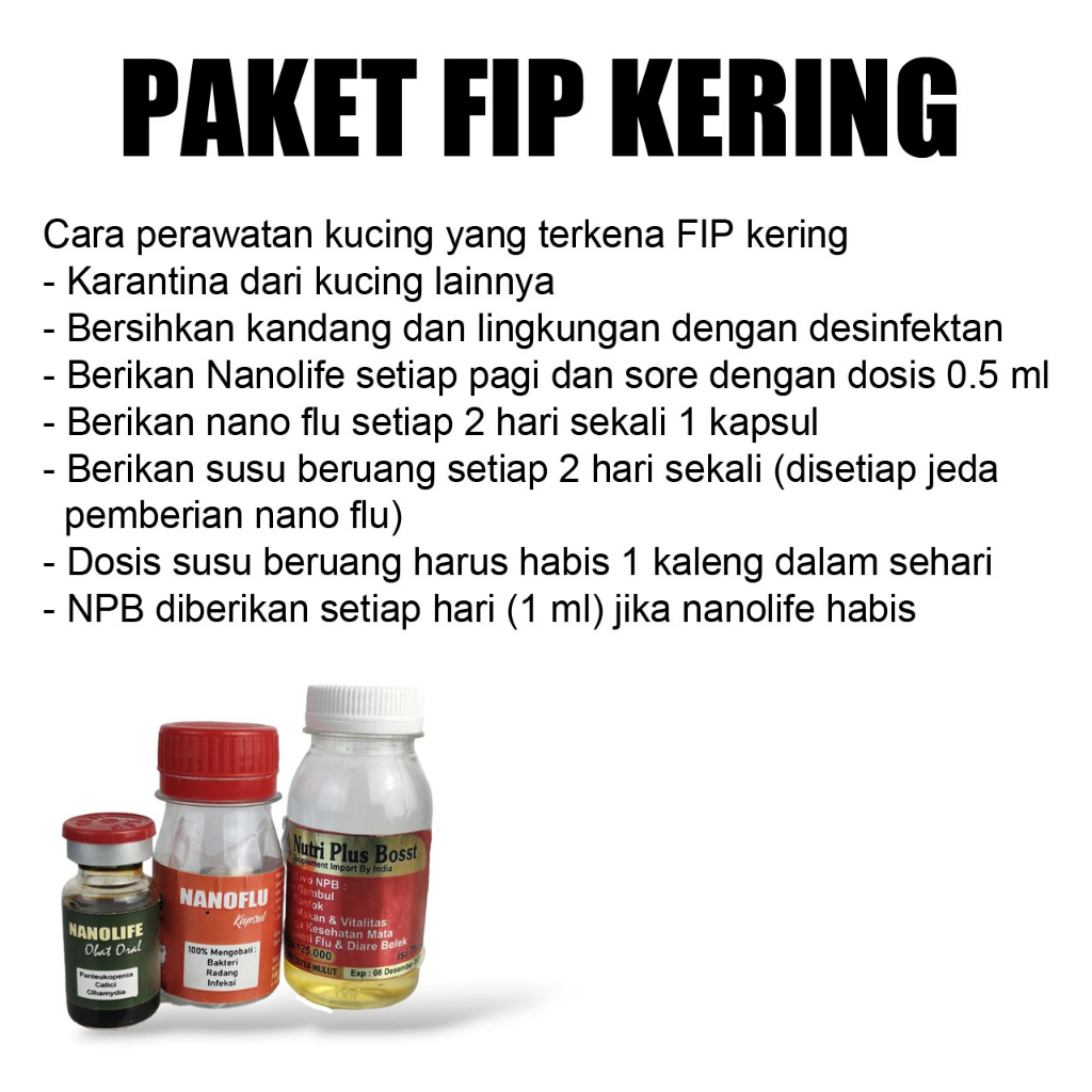 Cara perawatan kucing yang terkena FIP kering - Karantina dari kucing lainnya - Bersihkan kandang dan lingkungan dengan desinfektan - Berikan Nanolife setiap pagi dan sore dengan dosis 0.5 ml - Berikan nano flu setiap 2 hari sekali 1 kapsul - Berikan susu beruang setiap 2 hari sekali (disetiap jeda pemberian nano flu) - Dosis susu beruang harus habis 1 kaleng dalam sehari - NPB diberikan setiap hari (1 ml) jika nanolife habis