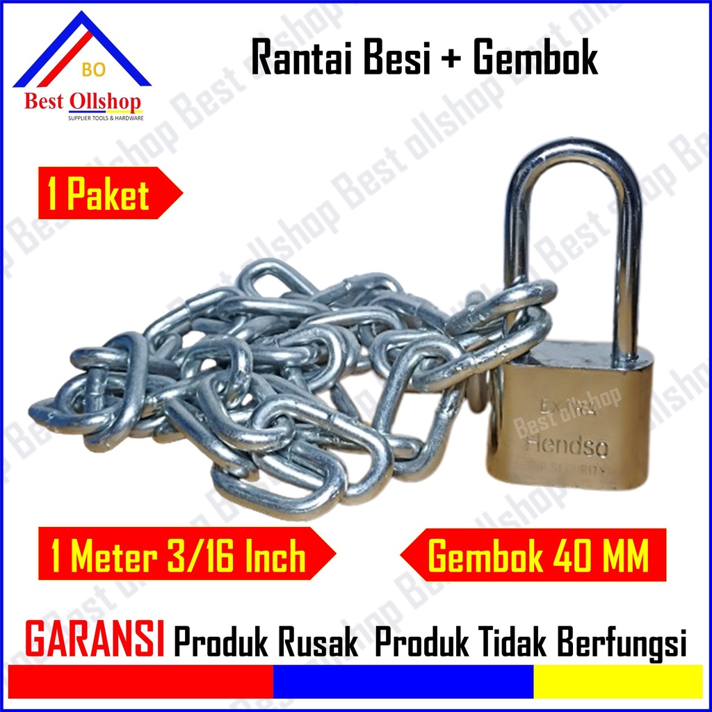 Paket Gembok Rantai 1 M Gembok Kunci Rumah Pagar Sepeda Motor Rantai Besi 3/16 5 MM Gembok 40 MM