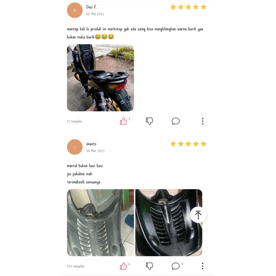 Diciptakan dari formula khusus dengan bahan baku terbaik memberikan hasil maksimal. Saat ini bisa jadi masih jarang atau mungkin belum ada produk serupa yang beredar di pasaran yang memiliki daya rekat / daya tahan/ daya cuci sehebat AUTO BLACK. Produk ini BEBAS SILICON 100%. Efek hitam permanen nya bikin motor kamu jadi baru lagi. BUKTIKAN !!! 1 botol isi bersih netto 30ML, umumnya dapat digunakan untuk pemakaian maksimal selama 12 Bulan +
