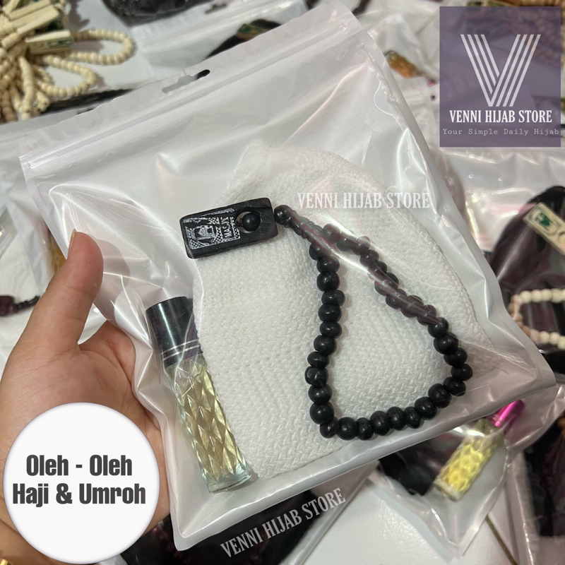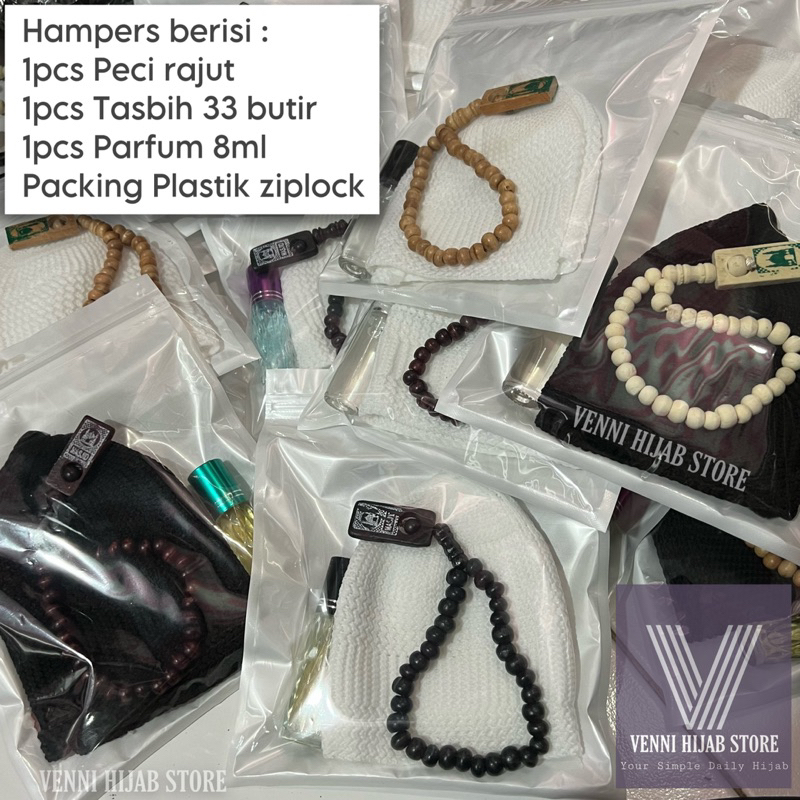 satu paket berisi : 1pcs peci rajut 1pcs tasbih 1pcs Parfum packing ziplock