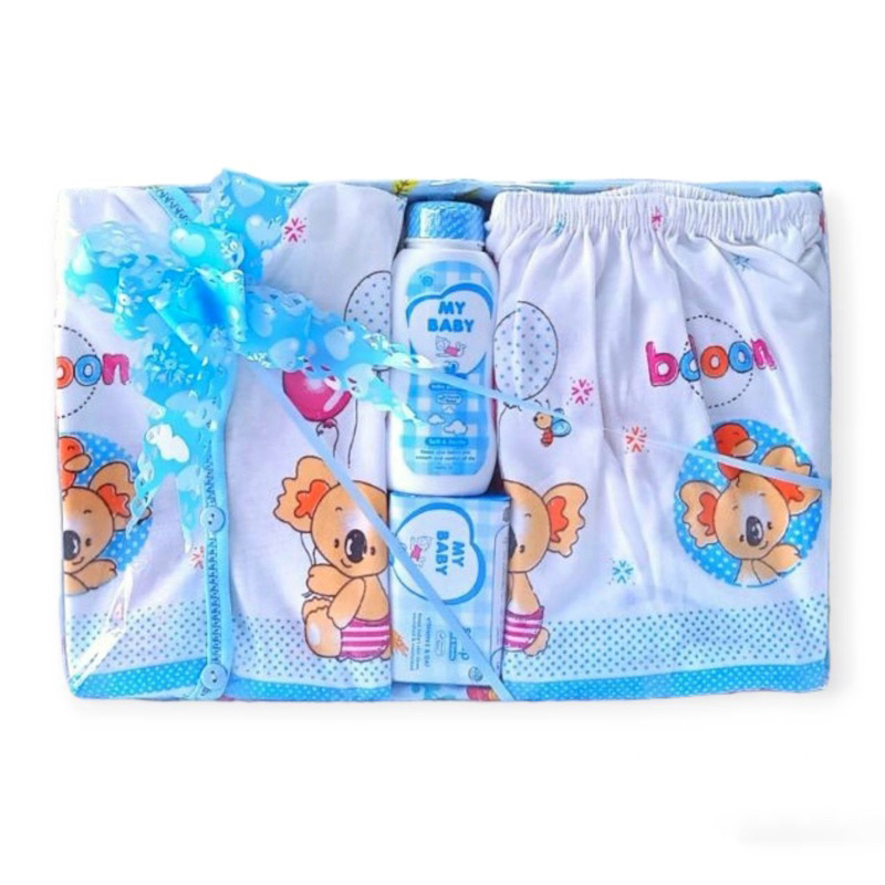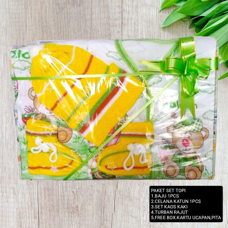 # Paket UTAMA 1 box hampers terdiri dari: - 1 pc baju bayi - 1 pc celana bayi - 1 pasang sarung tangan bayi - 1 pasang kaus kaki bayi - 1 pc bedak - 1 pc sabun