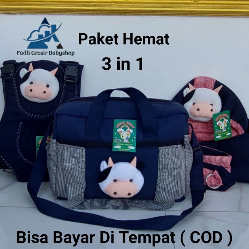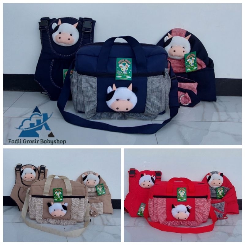 Paket Hemat ( 3 in 1 ) Tas Bayi Besar Fadli Boneka Sapi Dan Gendongan Bayi Samping Kerut Boneka Sapi dan gendongan bayi depan multi boneka sapi.