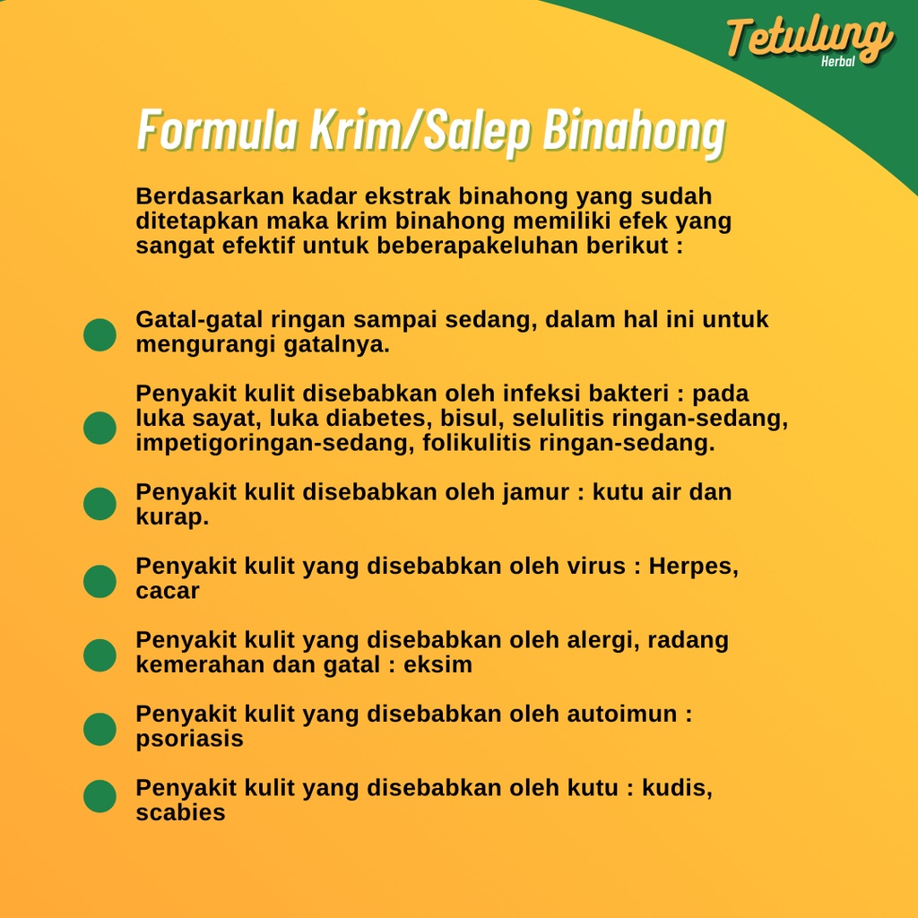 - Meredakan gatal dan biang keringat - Membersihkan luka dan membantu mencegah infeksi - Menghaluskan kulit - Mengurangi jerawat - Merawat Diabetes - Gatal-gatal - Alergi - Eksim - Kutu air - Kurap - Kadas - Psoriasis - Gatal Kepala - Sabun Binahong bisa dipakai sebelum sampho untuk gatal kepala dan ketombe