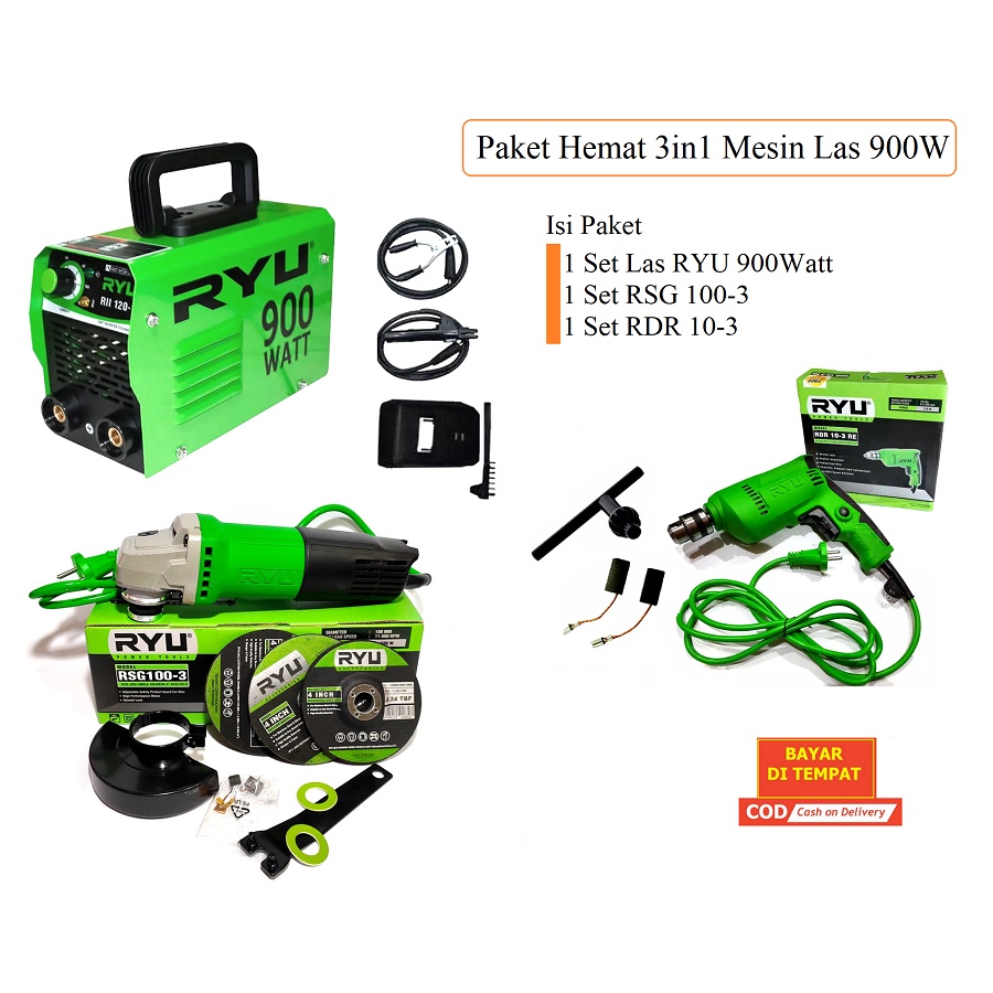 PAKET HEMAT 3IN1 Mesin Las 900 Watt RII 120-1 Travo Trafo RYU RII-1 900Watt PLUS Bor Ryu 10 mm RDR 10-3 + Gerinda Ryu 4 inch RSG 100-3 MURAH ORIGINAL BERGARANSI